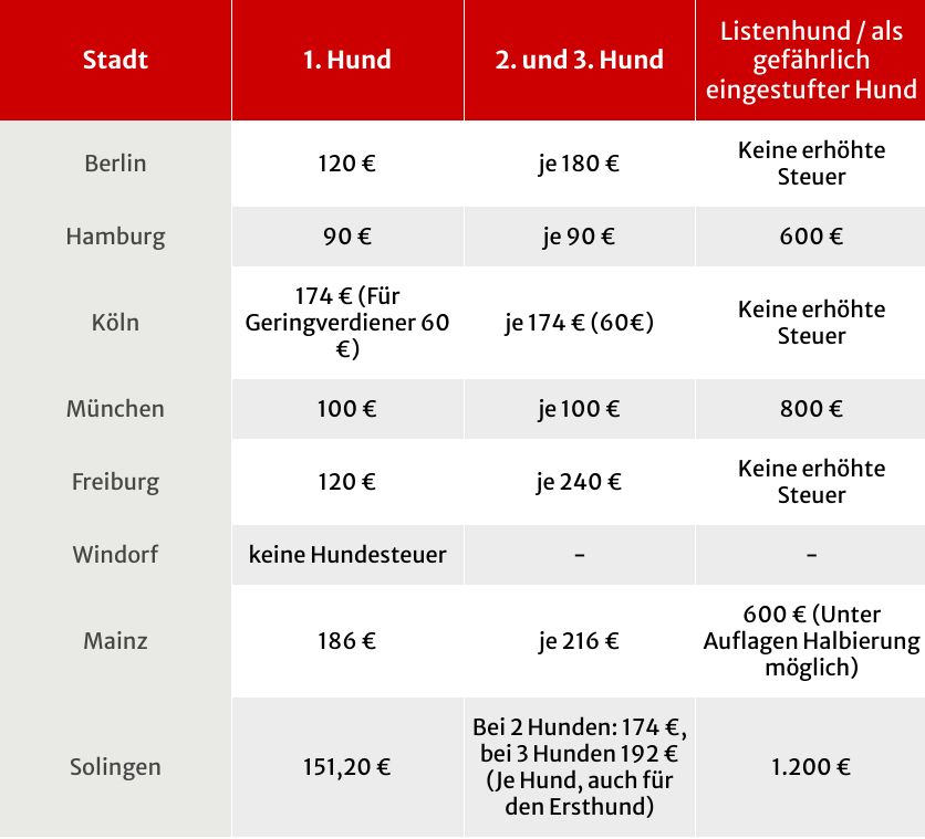 Durch die örtliche Regelung der Hundesteuer gibt es auf diese Frage keine deutschlandweite, pauschale Antwort. Allerdings gilt die Faustregel, dass die Hundesteuer in der Stadt oft höher ausfällt als auf dem Land und der Zweit- oder Dritthund oft teurer ist als der Ersthund. Bei sogenannten Listenhunden oder Hunden,die durch einen Vorfall als gefährlich eingestuft wurden, kann die Steuer deutlich teurer ausfallen. Für diese Hunde kann die Steuer bis zu 1.200 Euro im Jahr betragen. (Oberverwaltungsgericht, Az. 2 LB 34/15).